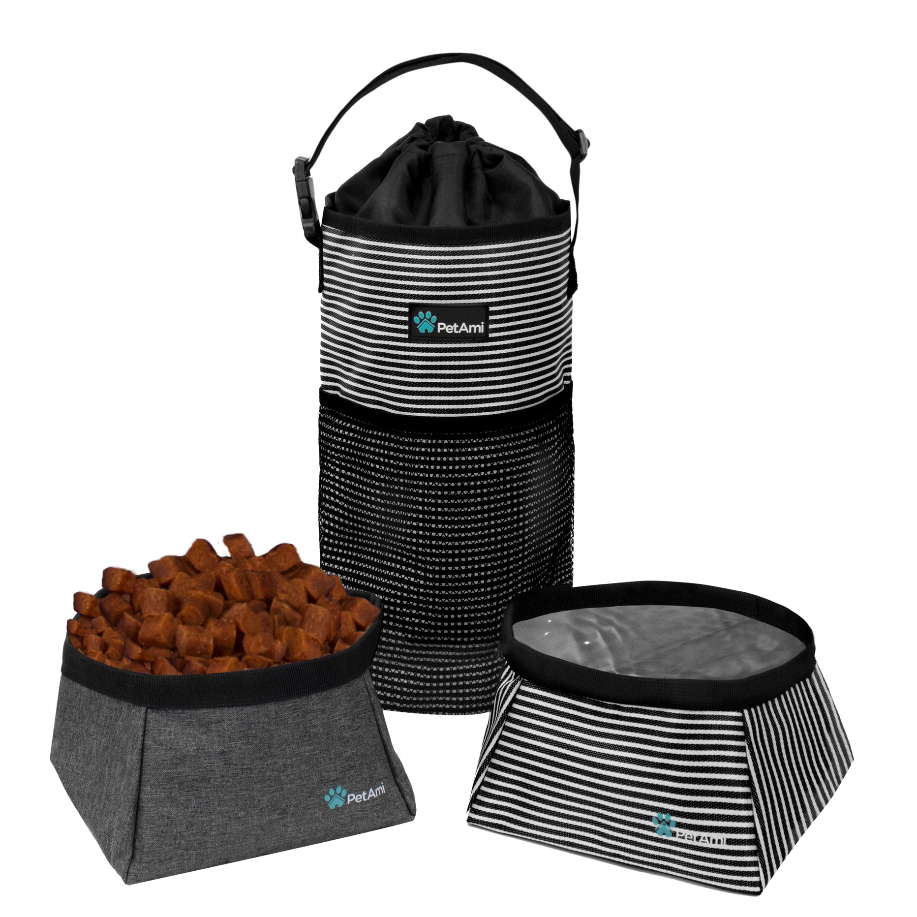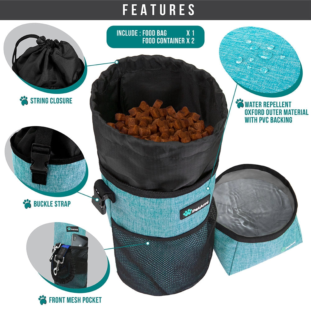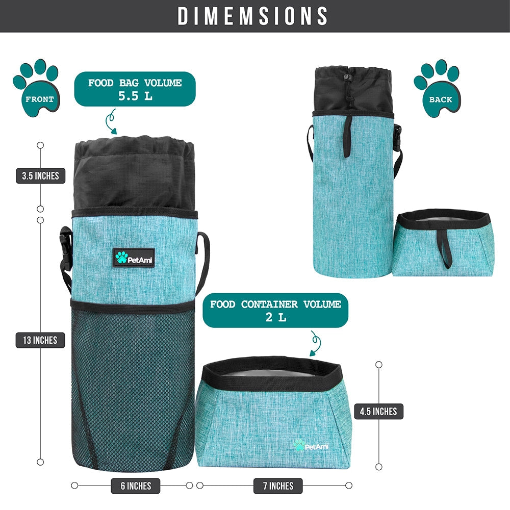 Denne foderpose og skåle til kæledyr er en nødvendighed, når du rejser med dine bedste venner. Ideel til rejser, overnatninger, ferier, camping og roadtrips.