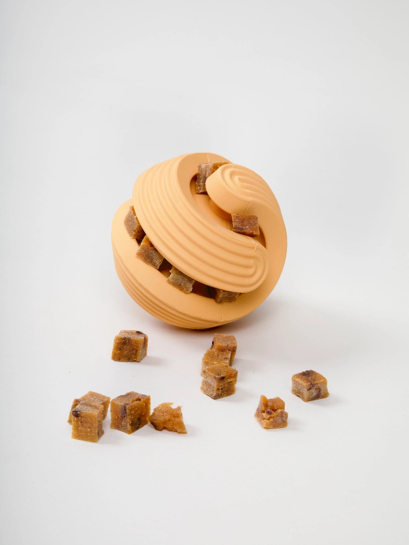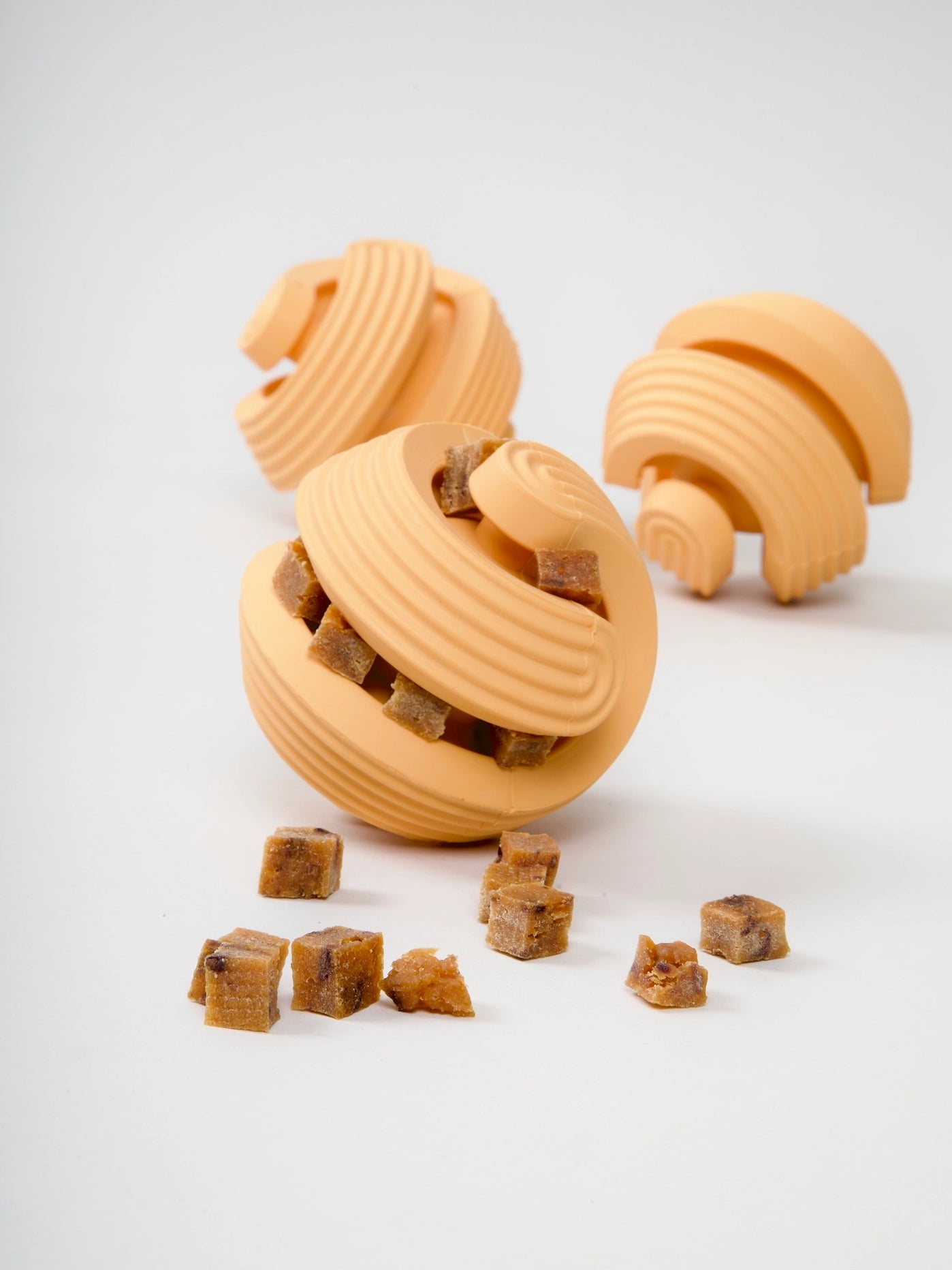 Godbidderne fastgøres indeni og mellem rillerne på bolden, hvorefter hunden kan bruge mellem 10-30 minutter på at få alle godbidderne ud af rillerne (afhængigt af hvor dygtig din hund er til dette).